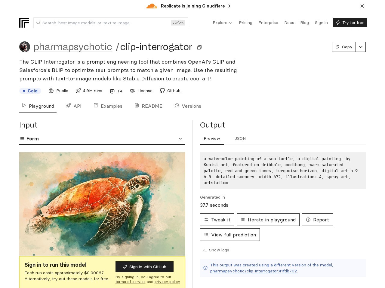该网站是Replicate平台上的pharmapsychotic/clip-interrogator项目页面,展示了一款提示词工程工具,结合OpenAI的CLIP和Salesforce的BLIP,可优化文本提示词以匹配给定图像,辅助文本到图像模型创作艺术作品。