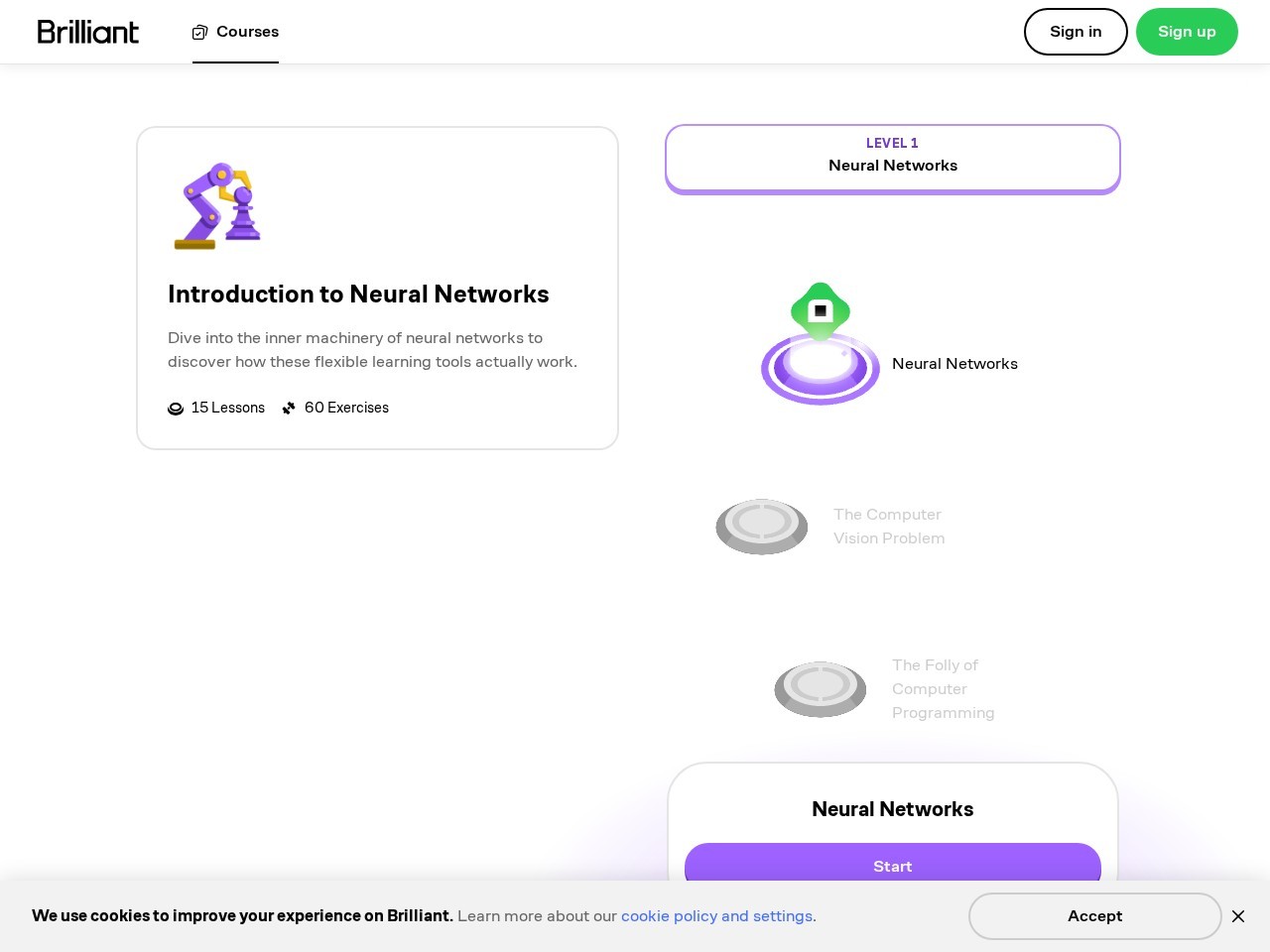这是Brilliant.org上的“神经网络入门”课程页面,Brilliant是一个专注于通过互动式学习模式讲解科学、数学及计算机科学等领域知识的平台。该课程旨在带领学习者深入了解神经网络的内部机制,揭示这类灵活的学习工具是如何工作的,课程以实践实验为核心,而非复杂的数学推导,帮助学习者建立对神经网络的直观理解。