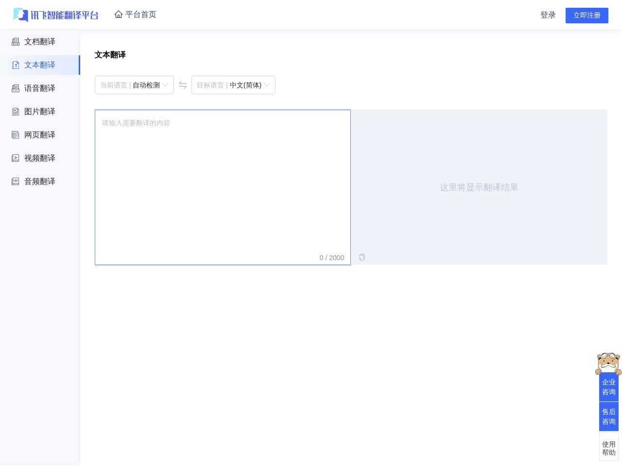 该网站是科大讯飞旗下的翻译平台,提供多种翻译服务,支持用户登录、注册,并有企业咨询、试用申请、免费额度申请等服务入口,同时提供电话咨询和微信1对1顾问服务,以及售后咨询和使用帮助。