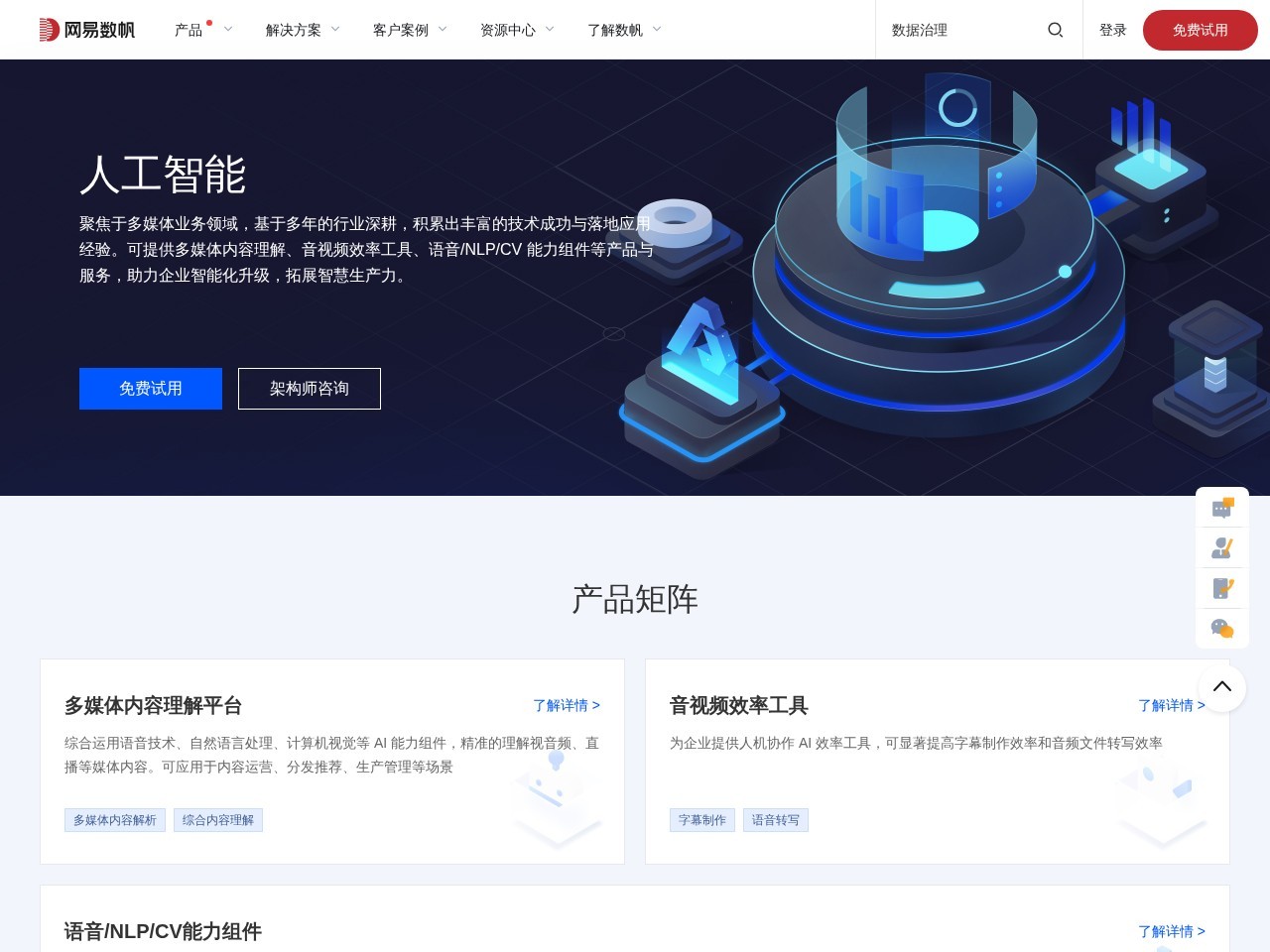 网易人工智能聚焦多媒体业务领域,依托多年行业经验,提供多媒体内容理解、音视频效率工具、语音/NLP/CV能力组件等产品与服务,助力企业智能化升级,拓展智慧生产力,服务对象包括网易集团内多个业务及产品。